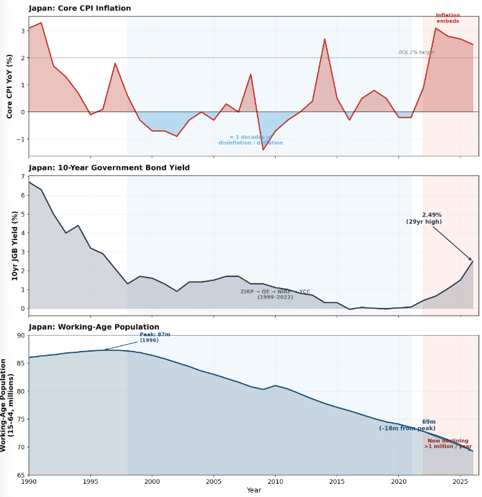 These moves reflect a deep structural regime change, underwritten and amplified by the very demographic pressures described above – and reinforced by global supply-chain reconfiguration and energy-price dynamics. These are the factors that led US Treasury Secretary Scott Bessent to warn last year that; "the Japanese have an inflation problem…"